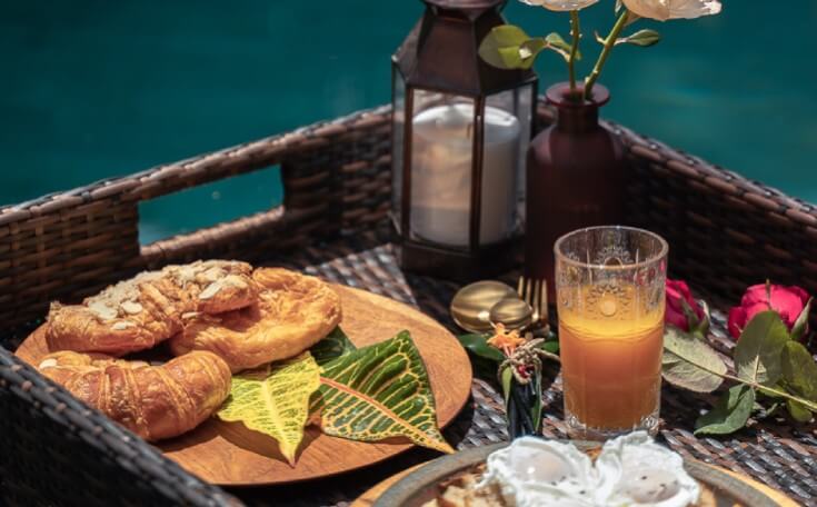 Breakfast and light lunch served in your villa daily, plus snacks, fruits, teas, and beverages throughout the day